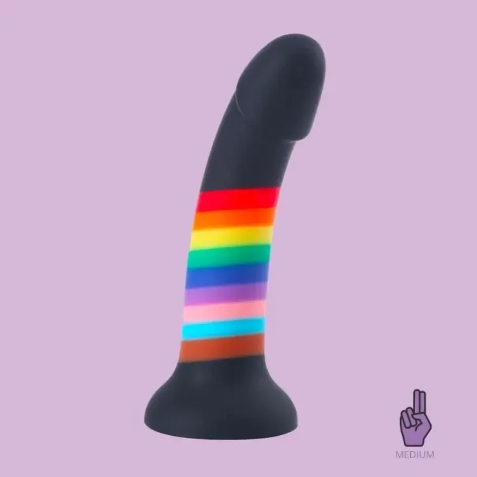 The lesbian-centric sex toy company Wet For Her has a plethora of dildo options for your strapping needs, but their Rainbow Strap-On Dildo is perfect if you want something a little bigger. It comes in three sizes, including “large,” which is 7.5 inches and 1.6 inches in diameter. Plus, it has a Pride flag print!