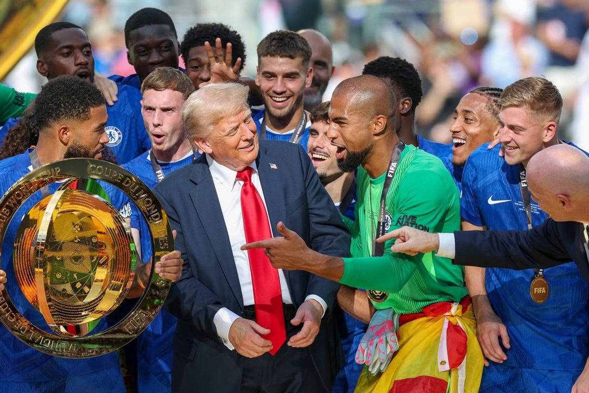 The president was on hand Sunday to present the trophy to the winning team. But when he passed the gleaming trophy over to Chelsea F.C. team captain, Reece James, Trump just....stuck around.